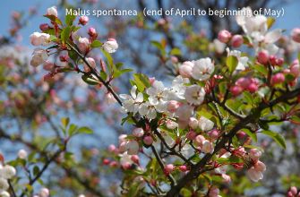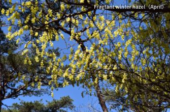 Japanese witch hazel (hamamelis) and fragrant witch hazel (Corylopsis glabrescens) start to bloom and cover the mountain slopes in yellow, signaling the start of the active season for animals. Woodpeckers tap away at the trunks while small birds reveal beautiful birdsong at the treetops.
