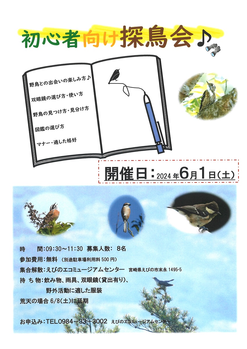 持ち物:飲み物、雨具、双眼鏡(貸出有り)、野外活動に適した服装