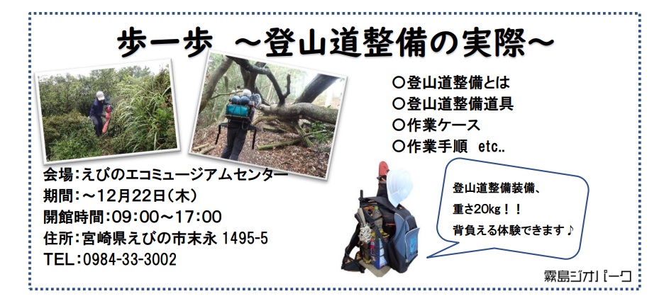 登山、散策、ピクニック、ハイキング、トレイルランニング、森林浴、自然体験・・・。山での楽しみ方は人それぞれ、その際利用されるのが登山道です。今回の企画展ではその登山道の整備について広く知っていただきたく開催しました。ぜひ開催期間中にご来館ください。