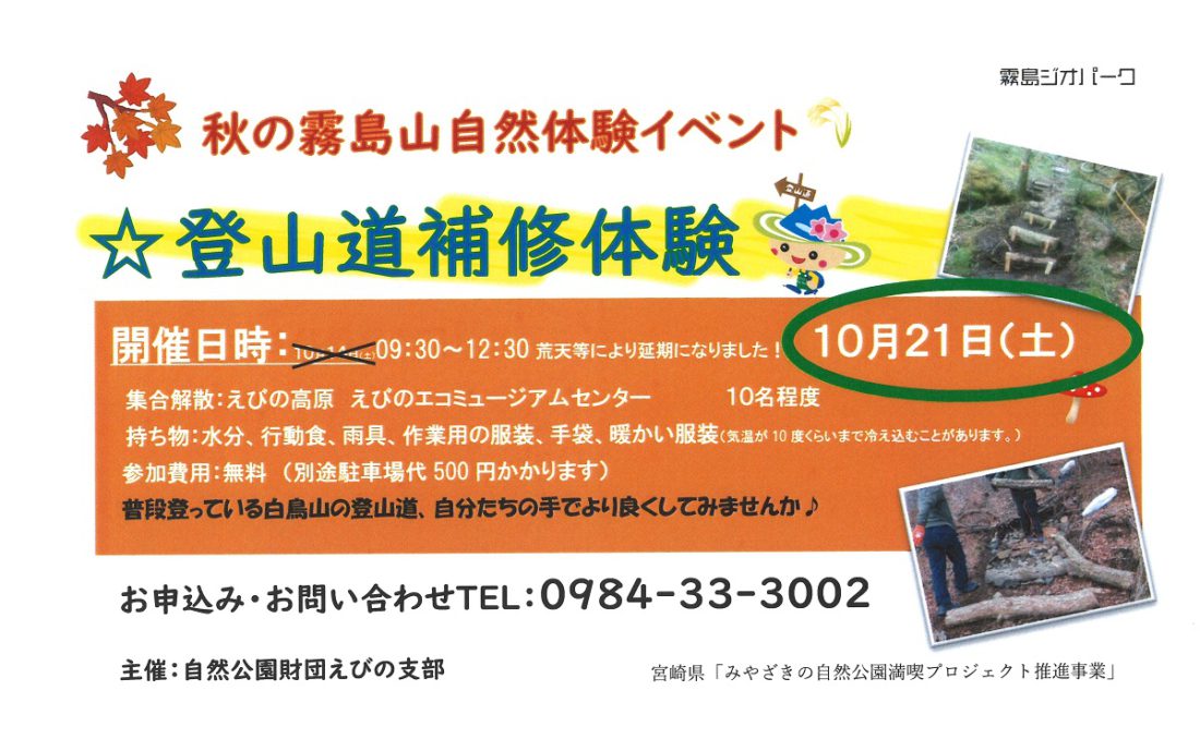 10月14日に予定していた「登山道補修体験」、荒天の予報のため10月21日に延期になりました。