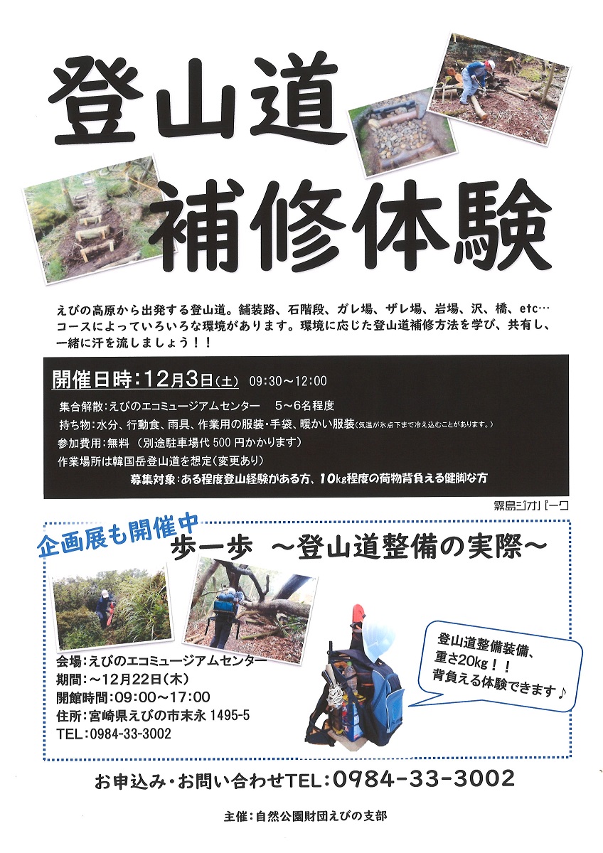 登山道整備装備、重さ20㎏を背負える体験できます♪
